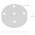 Diametro rosone 120 mm, spessore 25 mm. Fori passacavo da 10 mm. Inclusi serracavo tondi con cappuccio diametro 13 mm e altezza 17 mm, e tubo filettato M10x1 con altezza 15 mm. Presenti anche serracavo conici in termoplastica (altezza 43 mm, diametro 14,8 mm) per una gestione ordinata dei cavi.