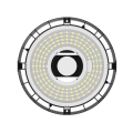 Corpo in alluminio pressofuso verniciato a polveri, diffusore trasparente stabilizzato UV e calore, guarnizione in silicone anti invecchiamento e viteria inox. Alimentatore incluso per rete AC 220 240 V 50 60 Hz con cos phi >0.9 e protezione surge 10 kV modo comune 6 kV modo differenziale. Versione colore nero RAL9005 finitura goffrata, per montaggio highbay con gancio e cavo H05RN F in uscita.