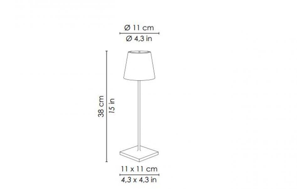 Lampada ricaricabile da tavolo, compresa di base di ricarica a contatto, con corpo in alluminio verniciato, diffusore in policarbonato e fonte luminosa a LED. La collezione Poldina ha un grado di protezione IP54 che la rende adatta sia all’uso interno che esterno. La durata della batteria è garantita per più di 9 ore.